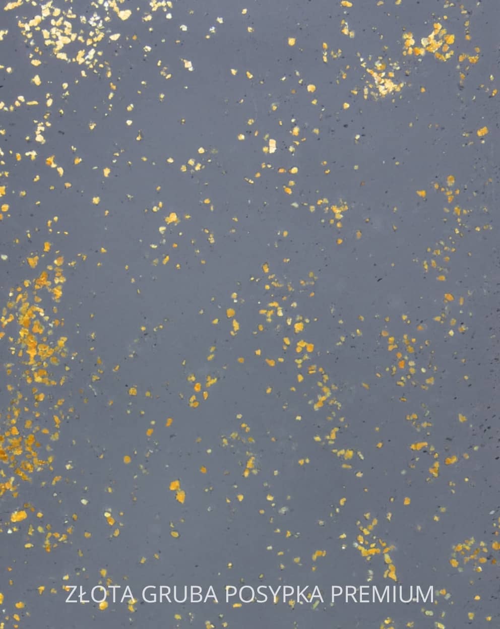 Złota Gruba Posypka Premium to najbardziej wyraziste połączenie surowego betonu i światła. Na grafitowej bazie rozsypano większe, nieregularne płatki złota, które pod kątem tworzą mocne refleksy. Industrial pozostaje industrialem – ale z odważnym, biżuteryjnym akcentem.