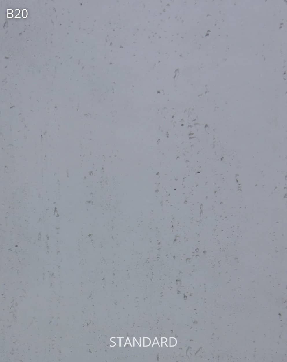 B20 to najbardziej zdecydowany odcień z jasnej palety: chłodny, mocny szary o charakterze surowej płyty. Wersja STANDARD ma równą, matową powierzchnię z subtelnymi porami – idealna, gdy beton ma stanowić świadomy akcent kompozycji, a nie jedynie tło.
