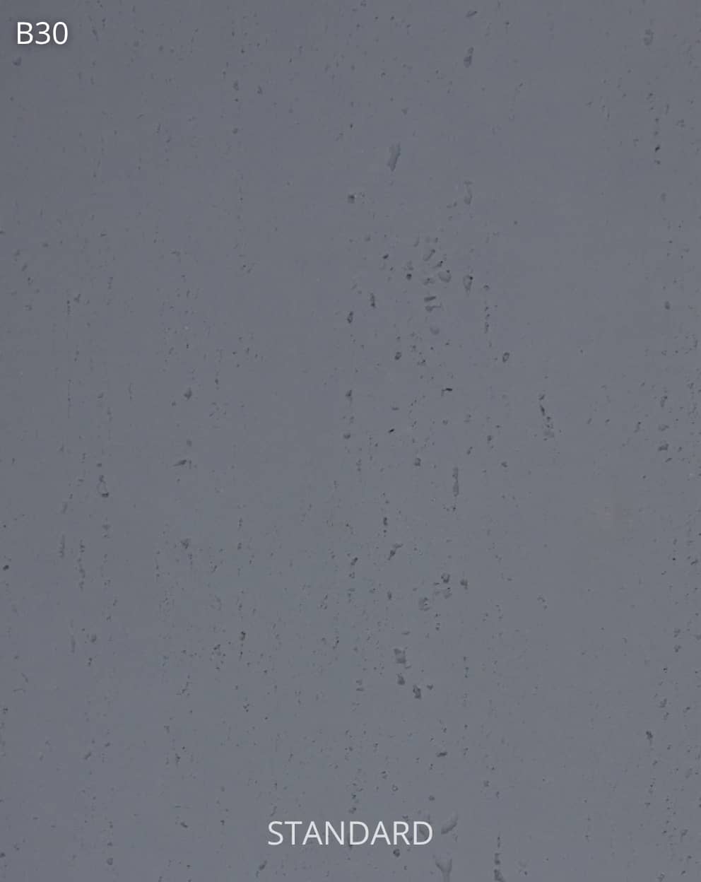 B30 to najciemniejszy odcień w palecie – stalowo-grafitowy beton w wersji STANDARD. Równa, matowa powierzchnia z drobnymi porami daje efekt masywnej płyty. To wybór, gdy beton ma być manifestem formy, a nie tłem.